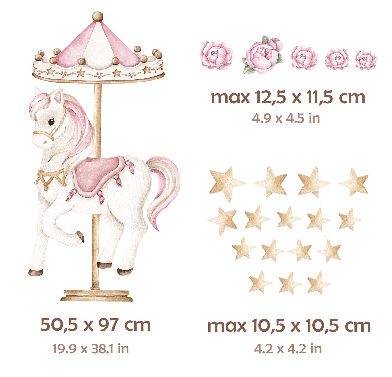 Un cheval de carrousel au style aquarelle, accompagné d’étoiles et de fleurs. Idéal comme décoration murale délicate ou en complément du carrousel complet.